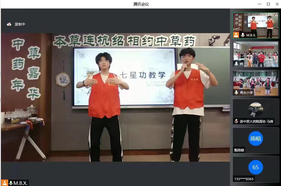 5月22日,VSport体育青年志愿者协会协同绍兴市秀水小学共同举办的“本草空中课堂”活动顺利开课。绍兴市秀水小学与开化桐村镇校王畈小学员工代表参与此次活动。本次活动以“大小牵小手,本草连杭绍”为主题,通过线上授课、互动教学等形式向参加活动的小朋友们普及中草药知识、传授中医健康保健操,给青少年播下一颗中医药文化的种子,号召青少年强健体魄,激发学习和传承中医药文化的兴趣。