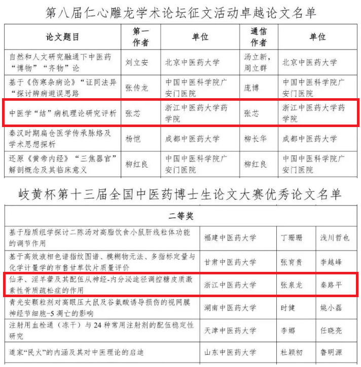 近日,第八届仁心雕龙学术论坛征文活动和岐黄杯第十三届全国中医药博士生论文大赛结果陆续公布。VSport体育张芯老师撰写的《中医学“结”病机理论研究评析》获评第八届仁心雕龙学术论坛征文活动卓越论文,张泉龙老师撰写的《仙茅、淫羊藿及其配伍从神经-内分泌途径调控糖皮质激素性骨质疏松症的作用》荣获岐黄杯第十三届全国中医药博士生论文大赛二等奖。