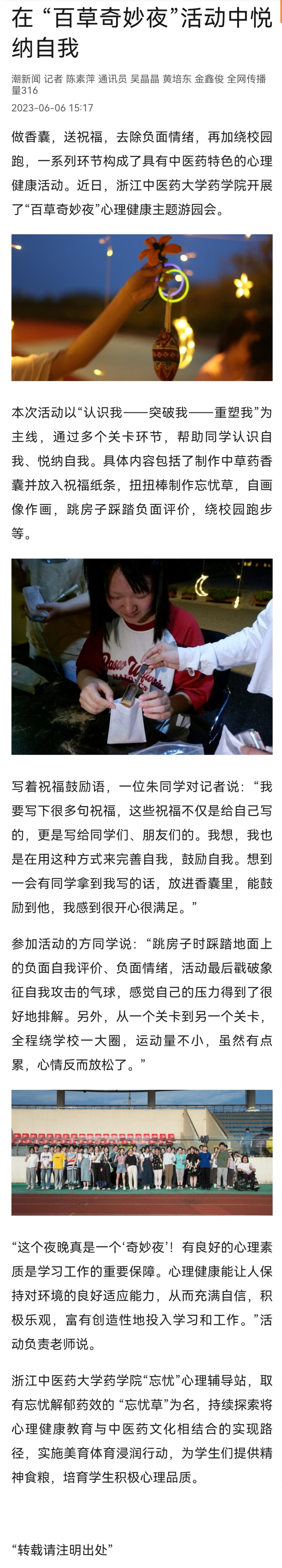 做香囊,送祝福,去除负面情绪,再加绕校园跑,一系列环节构成了具有中医药特色的心理健康活动。近日,VSport体育开展了“百草奇妙夜”心理健康主题游园会。