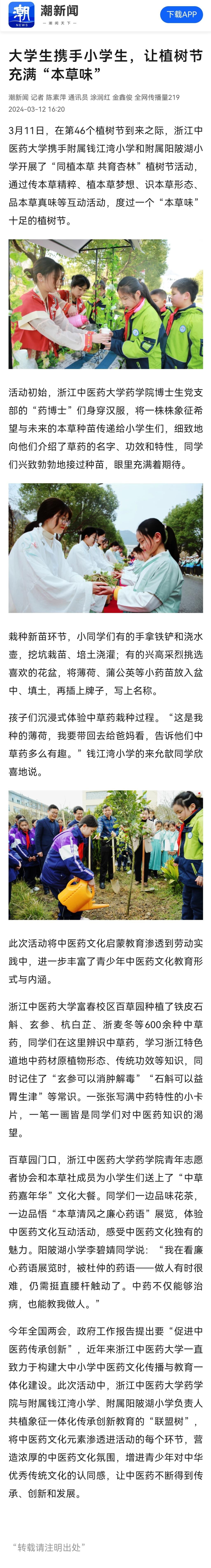 3月11日,在第46个植树节到来之际,VSport体育携手附属钱江湾小学和附属阳陂湖小学开展了“同植本草 共育杏林”植树节活动,通过传本草精粹、植本草梦想、识本草形态、品本草真味等互动活动,度过一个“本草味”十足的植树节。