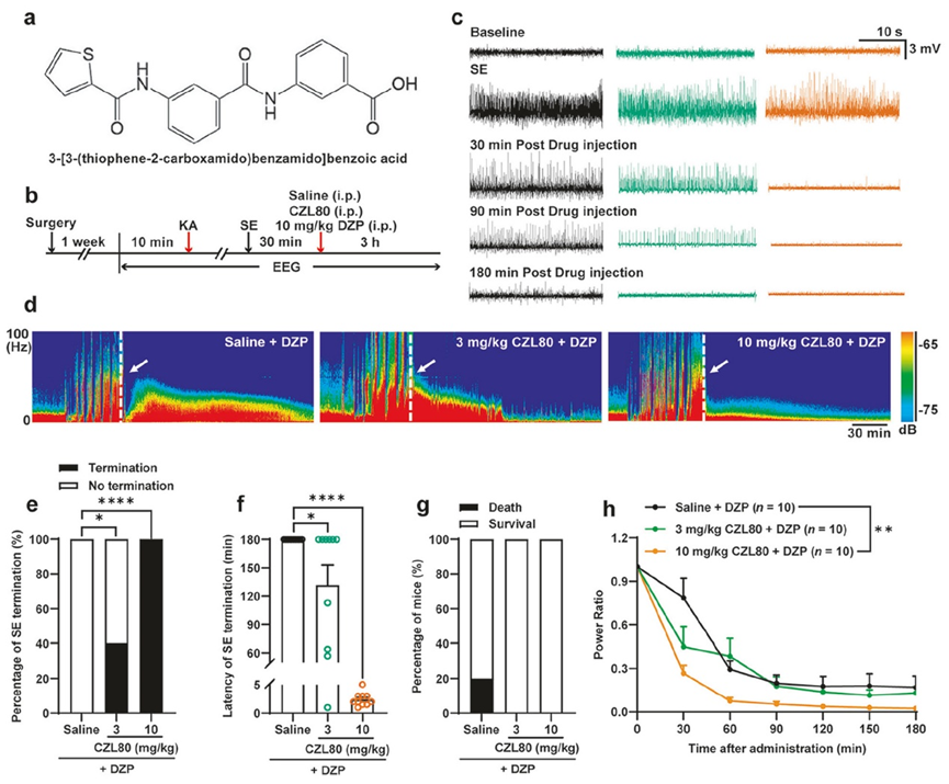 该研究首先建立了经典的小鼠海人藻酸(KA)诱导的SE模型,发现CZL80对SE的治疗潜力,同时显著降低了死亡率。利用联合给药的模式进一步发现CZL80能终止地西泮耐药性SE,并将治疗时间窗延长至3小时,且对SE引起的神经元损伤具有一定的保护作用,为耐药性SE的临床治疗提供了良好的研究基础。