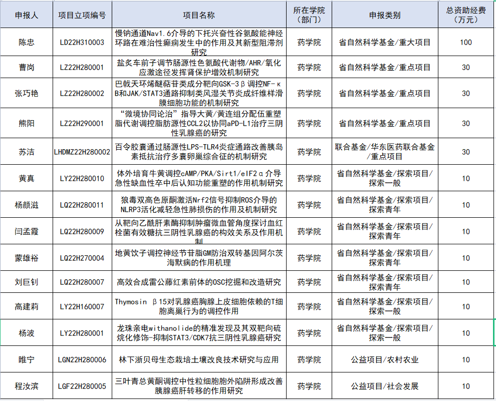 陈忠教授主持的《慢钠通道Nav1.6介导的下托兴奋性谷氨酸能神经环路在难治性癫痫发生中的作用及其新型阻滞剂研究》获批重大项目,实现了公司省自然科学基金重大项目零的突破。曹岗研究员主持的《盐炙车前子调节肠源性色氨酸代谢物/AHR/氧化应激途径发挥肾保护增效机制研究》、熊阳教授主持的《“微境协同论治”指导大黄/黄连组分配伍重塑脂代谢调控脂肪源性CCL2以协同aPD-L1治疗三阴性乳腺癌的研究》、张巧艳教授主持的《巴戟天环烯醚萜苷类成分靶向GSK-3β调控NF-κBJAK/STAT3通路抑制类风湿关节炎成纤维样滑膜细胞功能的机制研究》和苏洁老师主持的《百令胶囊通过肠源性LPS-TLR4炎症通路改善胰岛素抵抗治疗多囊卵巢综合征的机制研究》获批重点项目,使公司重点项目立项数取得了历史性突破。