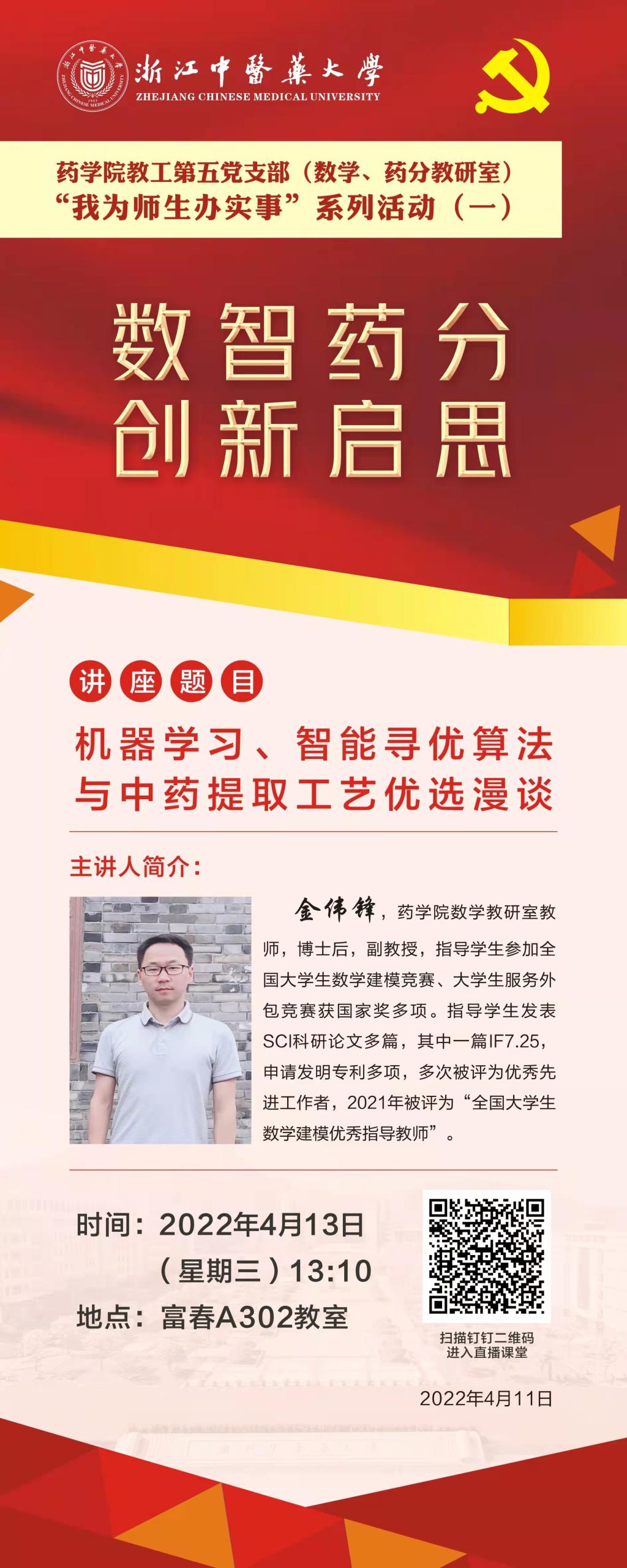 随着人工智能技术和理论的飞速发展,中医药与人工智能之间的学科交叉日益活跃。目前,在新医科建设内涵中明确鼓励医学与理科、工科等多学科交叉融通,及时将“互联网+健康医疗”、“人工智能+健康医疗”等医学领域最新知识、最新技术、最新方法更新到医学教学内容中,以期培养出符合新医科发展的创新复合人才。结合公司师生在应用相关模型和算法中遇到的常见问题和困惑,VSport体育教工第五党支部(数学教研室和药物分析教研室)将在4月开启以“数智药分,创新启思”为主题的系列活动,第一期以中药提取工艺优选为案例,深入浅出,助推中医药借助AI技术发挥重要作用。欢迎广大师生参加!