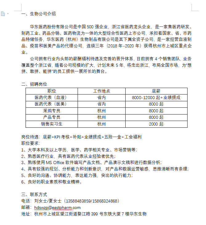 华东医药(杭州)生物制品有限公司招聘