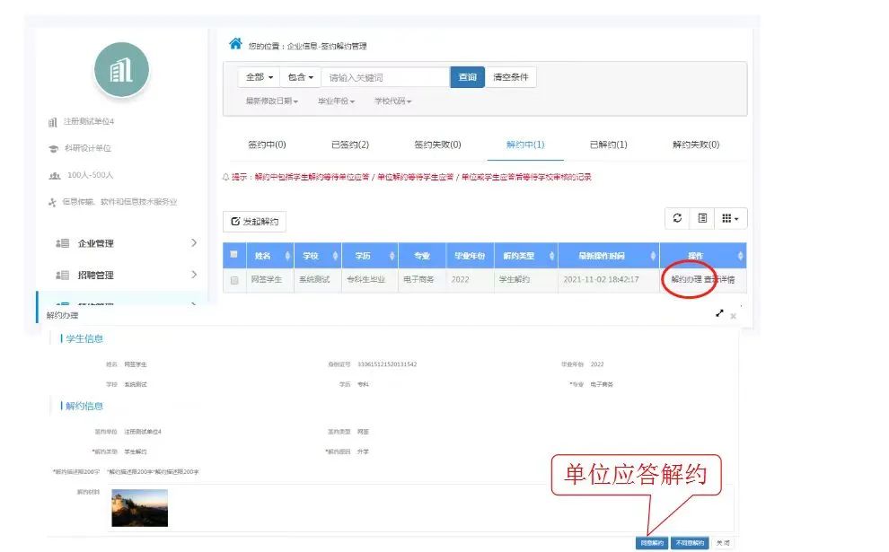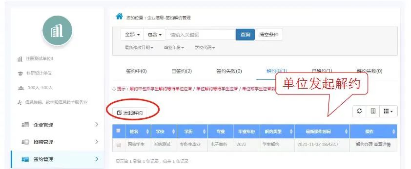 毕业生和用人单位均可发起解约申请。毕业生发起:登录网签平台,点击【违约申请】,如实填写相关信息后,点击【提交】发起解约申请。单位发起:登录网签平台,【签约管理】—【发起解约】。