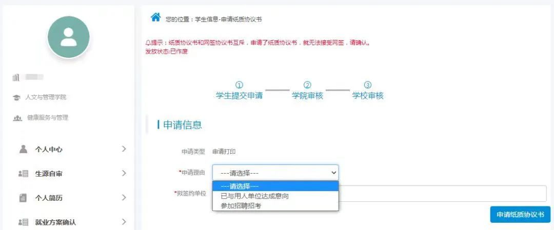 选择【申请纸质协议书】,申请理由选择【参加招聘招考】,然后点击【申请纸质协议书】,等待院、校审核。