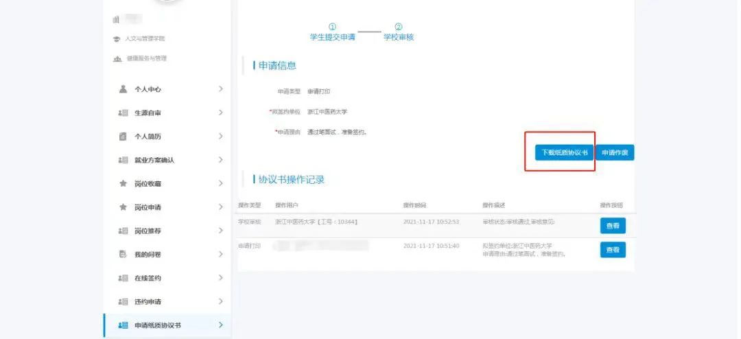 纸质协议书申请审核通过后,即可下载并打印(正反面),要求一式二份(员工、单位各1份)。