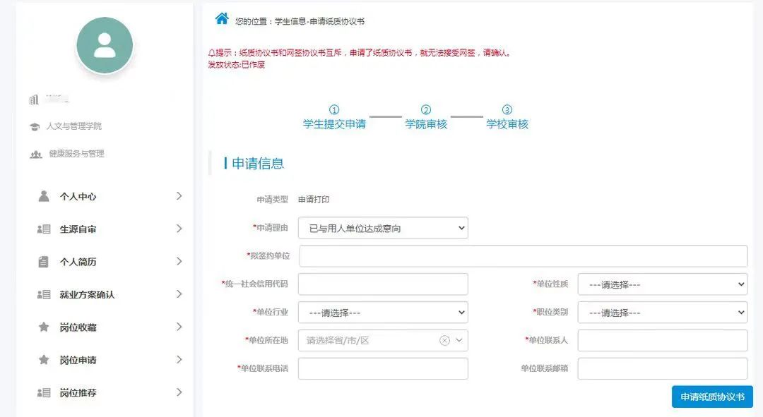选择【申请纸质协议书】,申请理由选择【已与用人单位达成意向】,填写拟签约单位相关信息,填写完毕后,等待院、校审核。