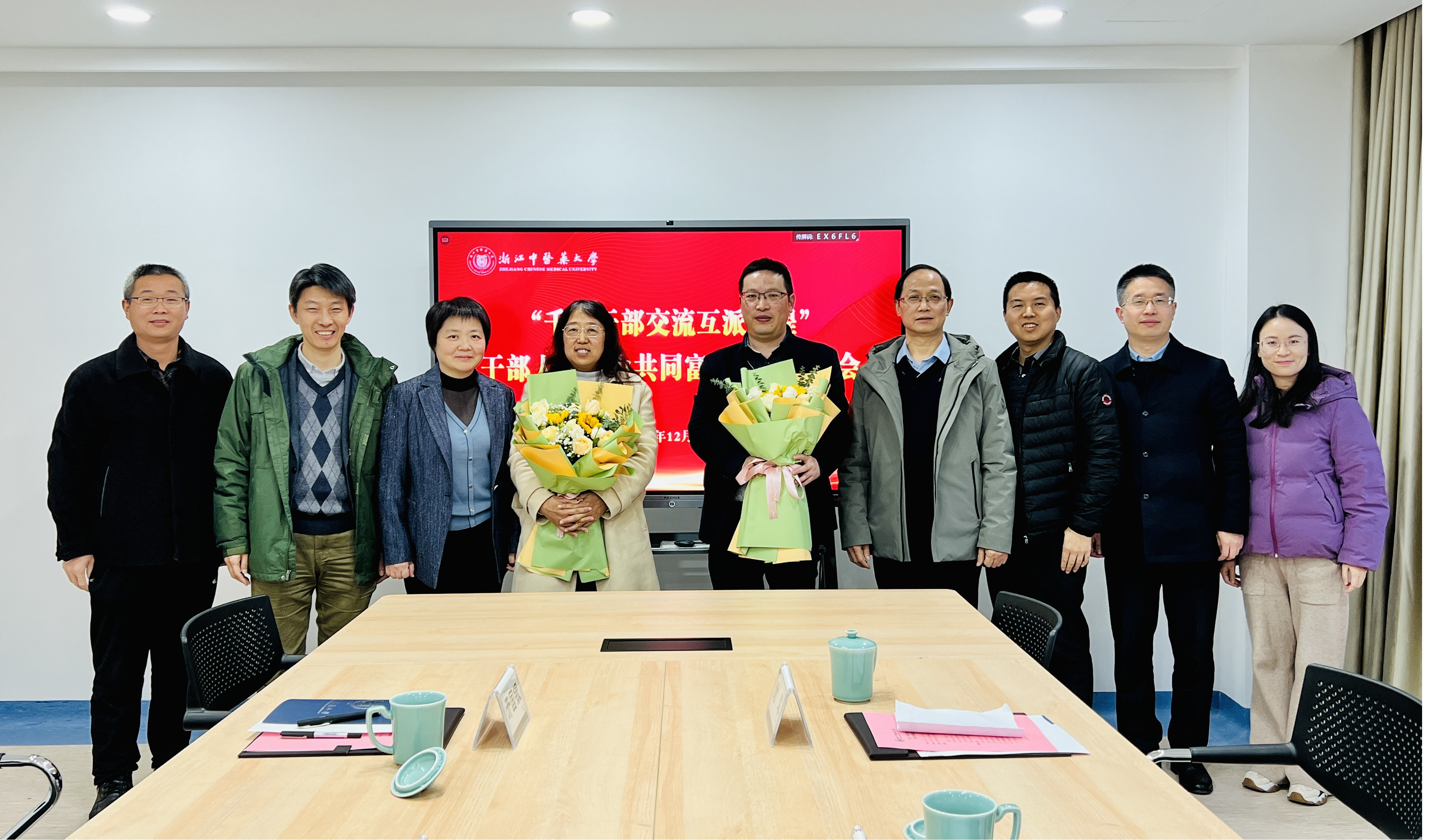 12月13日下午,省“千名干部交流互派工程”干部人才助力共同富裕行前欢送会在滨文校区行政楼三楼“统战之家”举行。公司党委副书记张元龙,公司党委委员、组织部部长黄爱军,公司党委书记谢军,人事处副处长罗锋,科研部副部长开国银,派出挂职人员赵利梅、廖广辉及所在团队负责人等参加欢送会。会议由黄爱军主持。