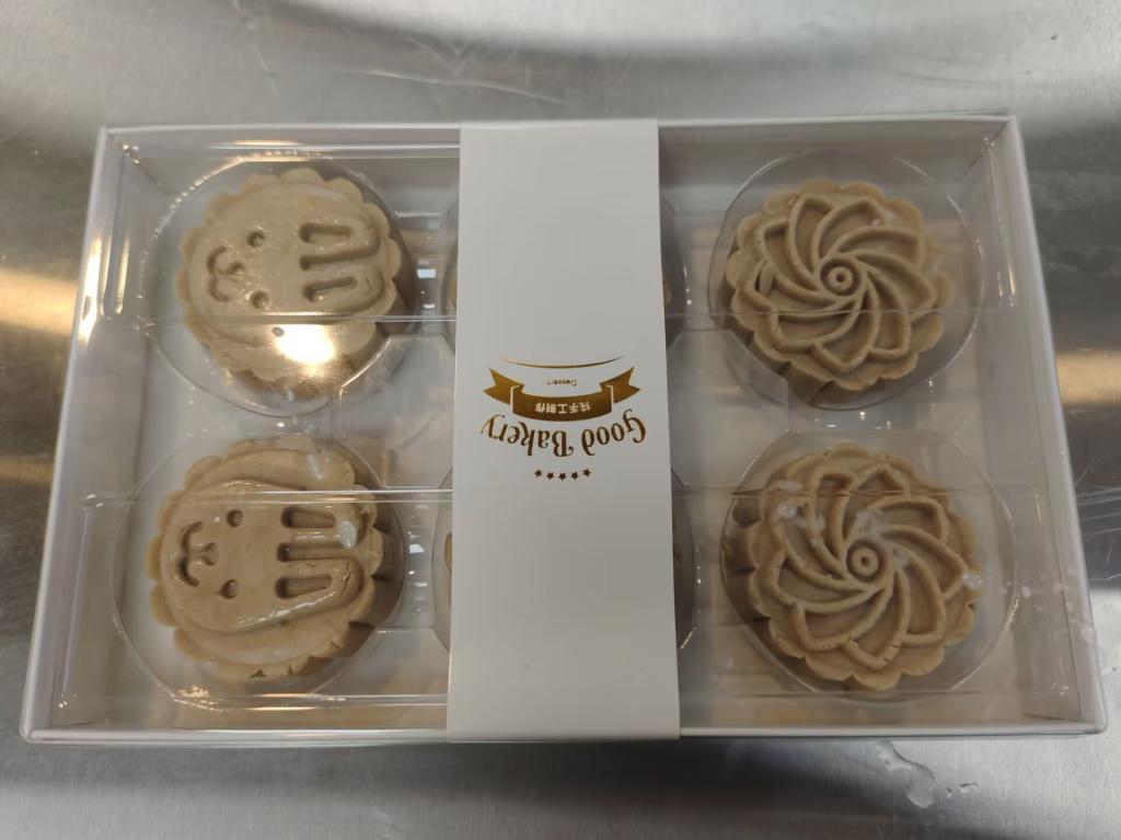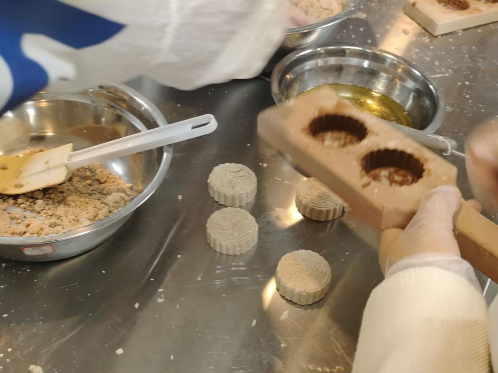 做出的八珍糕有大有小,有先有后,形状图案各异,有用塑料模具平稳挤出来的,有用木制模具哐哐砸出来的,实训室里笑声不断。有因为找到制糕诀窍发笑的,砸太大声害羞发笑的,还有看到成品欣慰的笑。